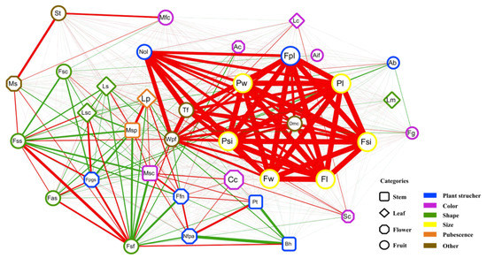 Phenotype correlation network of agronomic traits in pepper. Red and green lines represent negative and positive correlations, respectively. Line width is proportional to the strength of the correlation. Different shape nodes represent stem-related, leaf-related, flower-related and fruit-related traits, respectively. Different color frames of nodes represent plant structure-related, color-related, shape-related, size-related, pubescence-related and other traits, respectively.