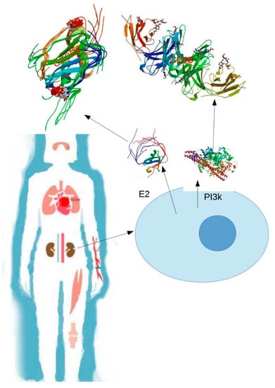 The affectation affecting several organs: for example, the kidney in the systemic lupus erythematosus can result from modifications in the proteins, leading to alterations in the tissue and loss of tolerance in these organs. The blue circle represents the cell, the E2 proteins are a ubiquinase that ubiquitin to C-X-C chemokine receptor type 4 (CXR4), and Phosphatidylinositol 3-Kinase (PI3K) is a kinase that phosphorylates Cluster of Differentiation 20 (CD20).