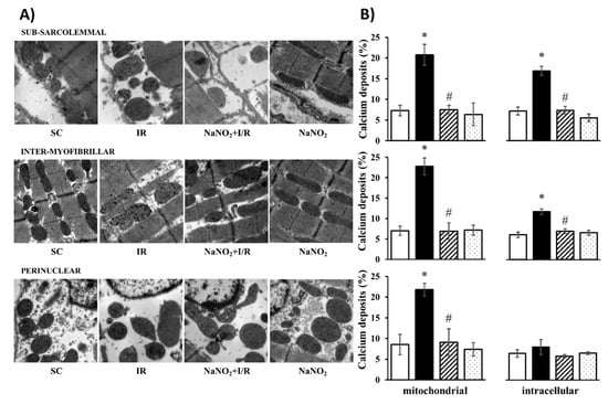 Representative images taken at 12000x magnification (A) and their quantitative analysis (B) of calcium deposits obtained by transmission electron microscopy (TEM) in the sham-operated (SC, n = 4) ischemic control (IR, n = 4) and sodium-nitrite-treated groups with (NaNO2 + ischemia and reperfusion (I/R), n = 4) or without I/R (NaNO2, n = 3). For each n, four or five pictures were evaluated and averaged. The images were taken from the subsarcolemmal, intermyofibrillar, and the perinuclear regions. Data are expressed as means ± SEM. Note: * p < 0.05 compared with SC, # p < 0.05 compared with IR.