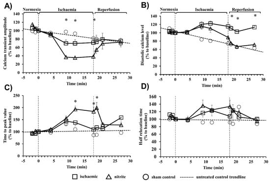 The effect of NaNO2 on the intracellular calcium transients in isolated cardiac myocytes. The changes in the Ca transient amplitude (A), the diastolic calcium level (B), the time-to-peak value (C), and in the half-time of relaxation (D) are shown. Isolated cardiomyocytes from the sham (n = 6) and nitrite-treated dogs (n = 8) were subjected to a 18 min ischemia and 10 min of reperfusion protocol. In order to assess the excretion of the fluorescent dye over time, some sham control cells (n = 3) were loaded with Fura-4-AM but not subjected to stimulated I/R. A trendline was fitted to these cells in order to measure the loss in fluorescence. Values are means ± SEM. Note: * p < 0.05 compared with the control.