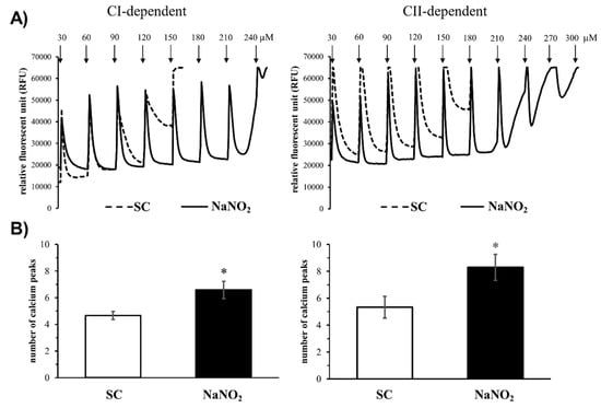 Representative images (A) and quantitative data (B) of the mitochondrial calcium retention capacity (CRC) of the mitochondria isolated both from the sham and sodium-nitrite-treated groups (SC-CI, n = 6; NaNO2-CI, n = 6; SC-CII, n = 6, NaNO2-CII, n = 5). The calcium overload was stimulated by repeated administration of 30 µM of CaCl2 at each measured time point. Values are means ± SEM. Note: * p < 0.05 compared with SC.