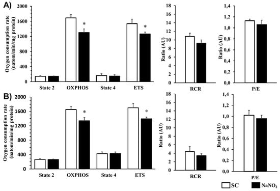 The effect of NaNO2 administration on the complex I (CI (A))- and complex II (CII (B))- dependent basal (state2), ADP-activated active respiration (OXPHOS), and uncoupling of the ETS. The respiratory control ratio (RCR) and the P/E coupling ratio (P/E) were also calculated in mitochondria isolated from the sham and nitrite-treated animals (SC: n = 8, NaNO2: n = 9). Values are means ± SEM. Note: * p < 0.05 compared with SC.