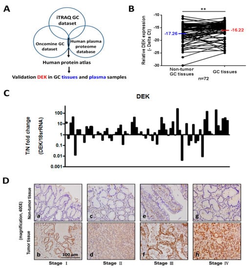 2.1. Identification and Validation Studies for DEK, a Potential Biomarker for GC