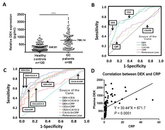 DEK levels in plasma from GC patients. (A) ELISA determination of plasma DEK levels in 120 healthy controls and 98 GC patients. (B) ROC curve analysis of DEK, CEA, and CA19.9 for discrimination between 98 GC patients and 120 healthy controls. AUC, area under the ROC curve. Logistic regression models were used for all pairwise comparisons. (C) ROC curve analysis of two combined in DEK, CEA, and CA19.9 for discrimination between 98 GC patients and 120 healthy controls. (D) Pearson’s correlation scatter plot of plasma DEK with plasma CRP in 98 GC patients (p < 0.0001).