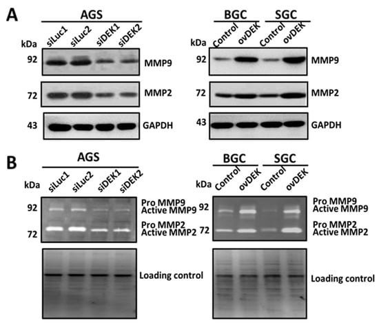 DEK induces MMP-9/MMP-2 level. (A) Total cell lysates from AGS, BGC, and SGC cells were analyzed via Western blot to detect MMPs. Actin served as an internal control. (B) Zymography revealing MMP-2 and MMP-9 expression in AGS, BGC, and SGC cells. Conditioned media from the three cell lines were assayed for MMP level as described in Materials and Methods. The electrophoretic positions of both proenzymes and active MMPs are shown.