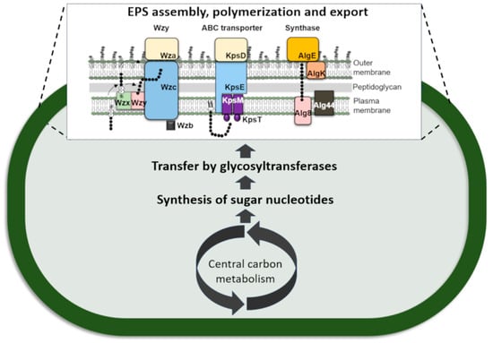 Studies performed in several bacteria point out that, regardless of the variety of surface polysaccharides produced, their biosynthetic pathways are relatively conserved [72]. Generally, the EPS biosynthetic pathway starts with the activation of monosaccharides and its conversion into sugar nucleotides; then, the monosaccharides are sequentially transferred from the sugar nucleotide donors to carrier molecules and assembled as repeating units. Finally, the EPS are exported to the exterior of the cell [1,72]. These steps require the participation of three groups of proteins, namely (1) enzymes involved in the biosynthesis of the sugars nucleotides, (2) glycosyltransferases to transfer the sugars to specific acceptors, and (3) proteins involved in EPS assembly, polymerization, and export [1,73,74] (Figure 1).