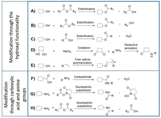 Representative strategies for functionalization of EPS by chemical modification. EPS can undergo esterification with anhydrides (A), esters (B), carboxylic acids (C), periodate-mediated oxidation followed by reductive amination (D), free radical polymerization with vinyl moiety (E), carbodiimide coupling (F) and nucleophilic substitution with esters and anhydrides (G,H), depending on the target functional group.