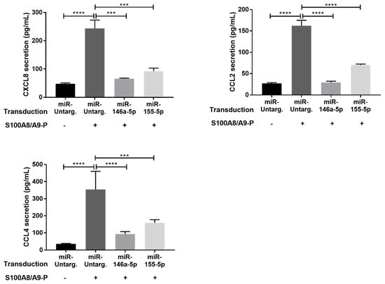 2.4.2. Effect of miR146a-5p and miR-155-5p Mimics on S100A8/A9-P-Induced Cytokine Secretion
