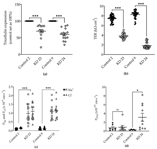 21]. Furthermore, the reduction by 30% (KD 23) had no significant effect on macromolecule permeability, however, did have an effect on ion permeability, indicating that there is already a significant impairment of the tTJ barrier which however is only affecting small solutes, while 4 kDa-dextran is still not able to pass. This leads to the assumption that the varying range of tricellulin expression may lead to different effects. The limit of macromolecule passage seems to range between a 30% to 40% reduction of tricellulin, while for small solutes the regulation is stricter.
