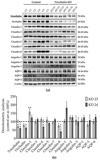 Cells grown on culture-plate inserts were scraped and homogenized in total lysis buffer containing 10 mM of Tris, 150 mM of NaCl, 0.5% of Triton X-100, and 0.1% of sodium dodecyl sulphate (SDS), and protease inhibitors (completeTM ethylenediaminetetraacetic acid (EDTA)-free; Roche, Basel, Switzerland). The samples were incubated 2 h at 4 °C (vortexed every 20 min), and then centrifuged at 11,000× g during 20 min. The pellet was discarded and the protein concentration in the supernatant was determined by the BCA (bicinchoninic acid) method (reagents were purchased from Pierce (Perbio Science, Bonn, Germany)) and quantified with a plate reader (Tecan Deutschland, Crailsheim, Germany). Aliquots between 10 and 15 µg protein samples were separated by 12% SDS-polyacrylamide gel electrophoresis and then transferred to a PVDF membrane (Perkin Elmer, Rodgau, Germany) for detection of tight-junction-associated marvel proteins (TAMP), claudins, angulins and AQPs. After blocking for 2 h in 1% PVP-40 and 0.05% Tween-20, membranes were incubated overnight with primary antibodies specific for tricellulin (Abfinity, Invitrogen), occludin (Invitrogen), angulin-1, -2, and -3 (Sigma-Aldrich, Germany), claudin-1, -3, -4, -5, -7, and -8 (Invitrogen), and AQP-1, -3, and -4 (Santa Cruz, Heidelberg, Germany). After removing the first antibody and three washing steps, the membranes were incubated 2 h with the second peroxidase-conjugated antibody (anti-mouse or anti-rabbit) in 2% of milk powder prepared in TBST 1X. For detection of the chemiluminescence signal induced by addition of Lumi-LightPLUS western blotting kit (Roche) a Fusion FX7 (Vilber Lourmat, Eberhardzell, Germany) were used. Densitometric analysis was performed with quantification software (Image Studio™ Lite, LI-COR Biosciences, Lincoln, Nebraska USA). Equal protein loading in each lane was verified by comparison with signals for β-actin (Sigma-Aldrich). For western blot analysis, lysates of at least three individual cell cultures were used and one representative experiment is shown.