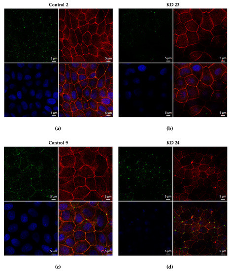 Figure 2a,b). The clonal variation also concerns the two control clones, here the differences are most prominent for claudin-1, claudin-5, and claudin-8. These claudins seem to have no effect on paracellular water transport, since the water transport of the two control clones did not show any difference. In the tricellulin knockdown clones, the expression of occludin, claudin-1, claudin-4, and claudin-8 was changed compared to the corresponding vector control. Considering the functional aspects of the variations it can be said that occludin, which is downregulated only in one of the tricellulin knockdown clones, is assumed to have no effect on TJ barrier function, either genuinely or through compensation of its downregulation by other tight junction proteins [