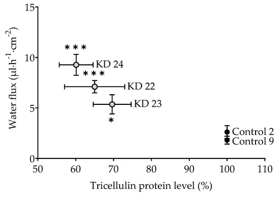 The question arises whether this is an all-or-nothing effect. If yes, one would postulate a threshold of tricellulin depression somewhere between 30% and 40%. In order to have closer look, an additional experiment was performed employing a clone with tricellulin reduced by 35% (clone KD 22). Being aware that this is based on three points only, resulting water flux did appear to correlate with the tricellulin expression, suggesting that the effect of tricellulin KD depression is gradual, starting at the level found for the controls (