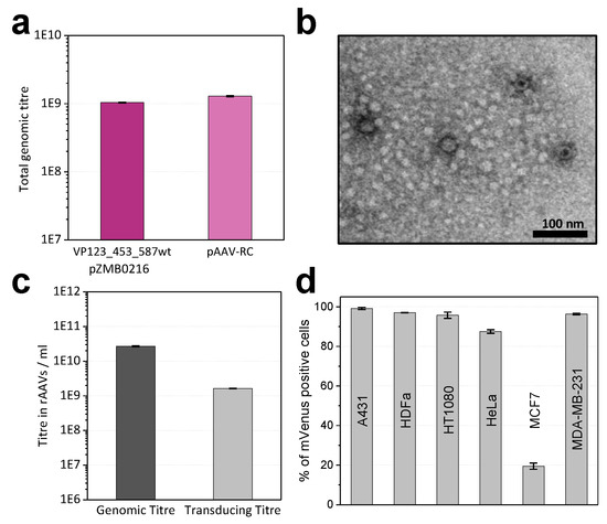 To obtain samples with higher purity, all further preparations were purified by iodixanol gradient ultracentrifugation. For unmodified rAAV2 wt (pZMB0522, pZMB0216) genomic titers were determined by qPCR (Figure 2c). Using a comparable setup but depending on culture conditions and transfection efficiencies, titers between 1 × 1010 to 1 × 1012 vg/mL have been obtained.