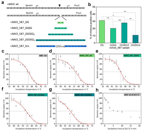 Previous experiments showed that, VP proteins tolerate peptide insertions at residue positions 453 and 587 [16,17]. We aimed at systematically analyzing the impact of increasing insertion length on rAAV thermal stability and biological function. Since a protein had already been inserted in the 453 loop region [22] and the 587 loop region is even more frequently used for modification, we opted to integrate linkers with increasing size at residue position 587 and investigated production and function of the resulting rAAVs. Glycine-serine linkers were chosen because of their flexibility and solubility, resulting in incremental changes correlating with length. Specifically, amino-acid linkers with the sequences GG, GGSG, (GGSG)2 and (GGSG)4 were integrated at the genetic level in all VP proteins to yield homogeneously decorated viral particles as presented in a schematic overview in Figure 3a.
