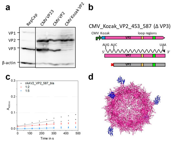 Establishment of mosaic 587 rAAV production using a modified four-plasmid system. (a) Analysis of cap protein expression after transient transfection in Western blots of crude cell lysates. Transfection of pZM0216_RepCap showed the expected ratio of 1:1:10 for VP1, VP2 and VP3 (lane 1). Three plasmid versions for VP2 expression were analyzed containing (i) the VP2 and VP3 cassette (lane 2, CMV_VP23, pZMB0160), (ii) the cassette with VP3 start codon removal (lane 3, CMV_VP2, pZMB0298), and (iii) the cassette with an upstream Kozak sequence and VP3 start knock out (lane 4, CMV_Kozak_VP2 (pZMB0315). Expression of VP3 after removal of the start codon can be explained with a second start codon 24 bp downstream and persistent leaky scanning. Figure S5 shows full length images. (b) Scheme of the final expression construct. (c) Nitrocefin assay probing rAAV2_VP2_587_bla mosaic viral particles in different concentrations for lactamase activity. Slopes of linear regressions of the first 300 s were used to calculate the concentration of active β-lactamases. (d) Theoretical structure of the mosaic particle (UCSF Chimera [30]) composed of the AAV2 wt structure (purple, PDB: 1LP3) and five copies of β-lactamase (blue, PDB: 3DTM).