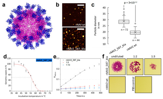 Comparison of rAAV2 wt and rAAV2_587_bla with respect to structure and β-lactamase activity. (a) Theoretical structure of rAAV2_587_bla constructed from the AAV2 wt structure (purple, PDB: 1LP3) and 60 copies of β-lactamase (blue, PDB: 3DTM). (b,c) AFM micrographs and particle size analysis of rAAV2 wt and rAAV2_587_bla. The calculated mean diameter of rAAV2 wt is 20 nm and 29 nm for rAAV_587_bla. Figure S8 gives AFM raw data. (d) Results of thermal stability assay based on qPCR data for rAAV_587_bla. Each point represents the standard deviation of a technical duplicate. Td,5 min was calculated with 55.6 ± 0.4 °C. (e) Nitrocefin assay, probing the β-lactamase activity of rAAV2_587_bla in different dilutions. (f) Images of a bacterial growth assay on LB Agar plates for β-lactamase activity. Samples with rAAV2_587_bla show a β-lactamase activity up to 1:3 dilutions, whereas for rAAV2 wt and PBS no colony growth was observed.