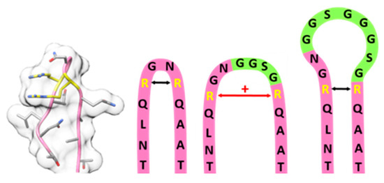 The insertion of small motifs presumably increases the tension within the β-hairpin and hence the distance between the arginines (Figure 6). Larger flexible insertions probably are compatible with the correct arginine positioning but with increasing size a shielding effect becomes more and more prevalent.