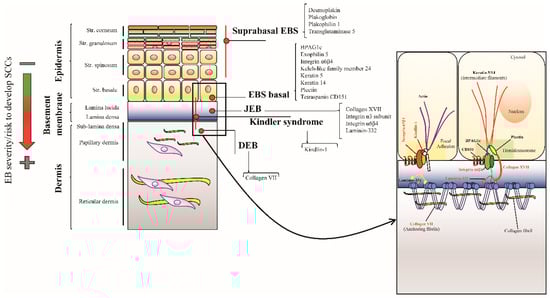 In recessive DEB, JEB and KS blistering occurs within or below the cutaneous basement membrane zone (BMZ) and leads to chronic wounds with fibrosis and inflammation healing with scarring sequelae. These patients have an increased risk to develop one or more cutaneous squamous cell carcinomas (SCCs) []. Usually, the tumors are localized at sites of chronic, hard-to-heal wounds and scarring, they are frequently multiple, and, specific to recessive DEB, highly aggressive representing the first cause of death in this EB subtype. Though the age of onset, cancer localization and carcinogenetic processes may be to some extent different across the various EB (sub)types, EB-related SCC (EB-SCC) represents an important model towards a more complete understanding of mechanisms responsible for carcinogenesis occurring within a fibrotic and inflamed microenvironment. In this review, we will discuss SCC clinical and molecular features in each cancer-prone EB type, focusing on the latest findings unveiling novel and potentially relevant pathomechanisms underlying tumor development in EB patients and highlighting gaps in the current literature. In addition, the most promising direct and indirect therapeutic strategies to counteract EB-SCC, with special reference to the devastating SCCs occurring in recessive DEB, will be addressed.