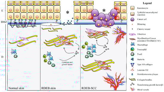 Schematic representation of squamous cell carcinoma (SCC) microenvironment in recessive dystrophic epidermolysis bullosa (RDEB) patients. Left panel. Normal skin. Basal keratinocytes firmly adhere to the basement membrane zone (BMZ) through hemidesmosome protein components (blue ovals) and are also the main producers of laminin-332, an essential component of epithelial BMZs, and of type VII collagen (COL7) that assembles into anchoring fibrils (AFs). AFs extend from the lower part of the BMZ into the upper dermis (papillary dermis), ensuring dermal-epidermal cohesion. Middle panel. In RDEB patients, COL7 deficiency impairs anchoring fibrils formation and leads to skin fragility and blistering (red asterisk) after minor traumas. At sites of chronic blistering, the dermis is enriched in inflammatory cells (neutrophils, macrophages and T-cells) and myofibroblasts: Both cell types produce high amounts of transforming growth factor (TGF)-β1, a master regulator of fibrosis, in an unremitting and self-renewing cycle. In addition, myofibroblasts abundantly produce extracellular matrix components, contributing to dermal stiffening. Chronic wounds (black asterisks) also show high levels of bacterial colonization that contribute to exacerbating inflammation. In the dermis of RDEB patients, the derailed production of cytokines, growth factors and ECM members create the permissive environment for keratinocyte transformation. Right panel. RDEB-SCC microenvironment. Stromal inflammation and fibrosis represent the scaffold for tumor development and progression. Cells with features of cancer-associated fibroblasts (CAFs-like cells) populate tumor stroma and contribute to tumor growth. Keratinocytes undergo epithelial-mesenchymal transition (EMT) and convert to carcinoma cells. SCC microenvironment is characterized by huge inflammation and fibrosis.