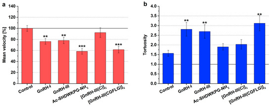 Effects of GnRH derivatives on the chemokinetic activity (mean velocity—a; tortuosity—b) of Tetrahymena. The effects of the GnRH peptides were studied in the following concentrations—GnRH-I: 10−6 M, GnRH-III: 10−6 M, Ac-SHDWKPG-NH2: 10−6 M, [GnRH-III(C)]2: 10−11 M, and [GnRH-III(CGFLG)]2: 10−6 M. The mean velocity is expressed as a percentage of the control. Data represent the mean of 4 parallels ± SD. The levels of significance are shown as follows: **, p < 0.01; ***, p < 0.001.