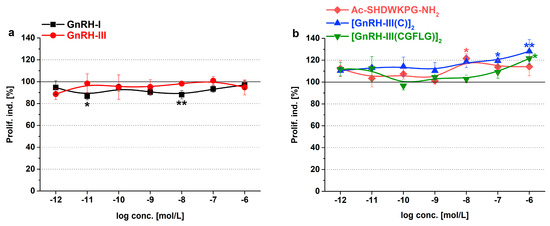 The native hormones had only a moderate effect on Tetrahymena proliferation. The negative effect of GnRH-I (86.7% and 88.0%, F7,24 = 1.33, p = 0.023 and 0.039 at 10−11 and 10−8 M) was more prominent after 6 h of incubation (Figure 2a), while GnRH-III could slightly increase the growth in the long-term, but only at 10−6 M concentration (109.1%, F7,21 = 1.036, p = 0.039, p < 0.05) (Figure S2a).