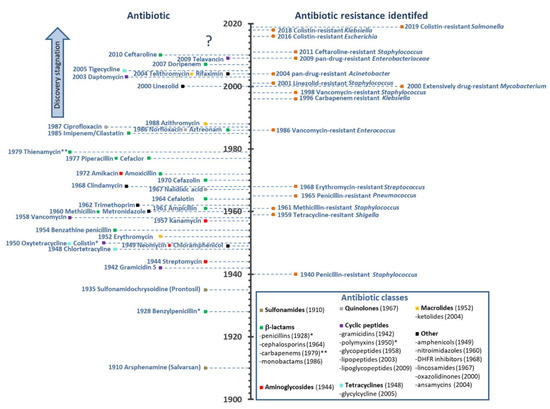 Timeline of antibiotic development as released and in parallel with the timeline for emergence of drug-resistant bacteria [2,6,11,13,17,18,19,20,21,22,23,24,25,26,27,28,29,30,31,32,33,34]. All antibiotic classes are represented by at least one antibiotic. For figure clarity, not all antibiotics nor all antibiotic-resistant bacteria are represented in the timeline. (*) Date of discovery not of release, (**) date of discovery, never introduced due to instability in an aqueous solution [35].