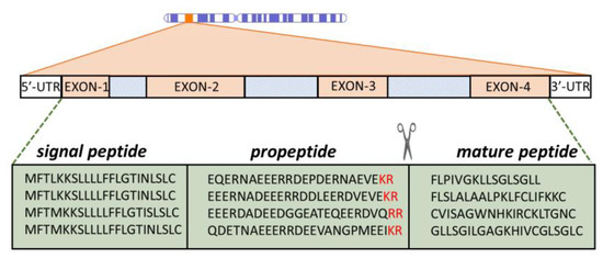 Representation of AMP expression. Peptides are cleaved at dibasic cleavage sites (-KR, -RR, in red). The proregion has a distinctly anionic nature. Depicted peptide sequences belong to anuran AMPs from the Ranidae family [60,61,62,63].
