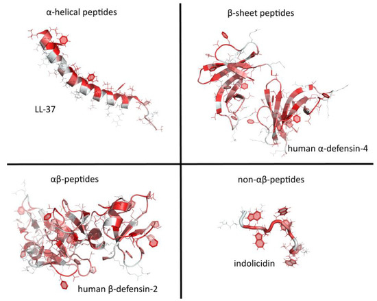 An overview of major structural classes of antimicrobial peptides. The structures taken as an example were solved either by nuclear magnetic resonance spectroscopy or X-ray diffraction and coordinates were downloaded from Protein Data Bank (PDB) (https://www.rcsb.org/) [77]. PDB IDs: LL-37 (2k6o), human α-defensin-4 (1zmm), human β-defensin-2 (1fd3), and indolicidin (1g89). Visualization was done using PyMOL 1.8 [78] and amino acids colored according to a normalized Eisenberg hydrophobicity scale (light grey—polar, red—hydrophobic) [79].