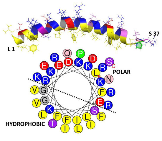 Secondary structure and helical wheel projection of human cathelicidin LL-37. The structure and projection were, respectively, obtained from PDB [77] (ID: 2k6o) and HeliQuest [109]. The residues were colored according to their hydrophobicity with ~40% hydrophobic and 60% polar amino acids in an appreciable amphipathic arrangement. Hydrophobic (yellow and green), polar charged [red (−) and blue (+)], polar uncharged (light to dark purple), and glycine (grey).