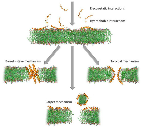 - Historically, the first proposed mechanism was for a certain number of peptide molecules to assemble and flip from a parallel to a perpendicular orientation with respect to the membrane surface, to form barrel-stave pores. The amphipathic structure would allow their hydrophobic surface to interact with the membrane lipids and hydrophilic regions to line the core of the channels, which promotes lateral peptide-peptide interactions. This mechanism, however, has turned out to be rare, and seems to apply to a limited number of AMPs, such as pardaxin [125] and non-proteinogenic alamethicin [126].