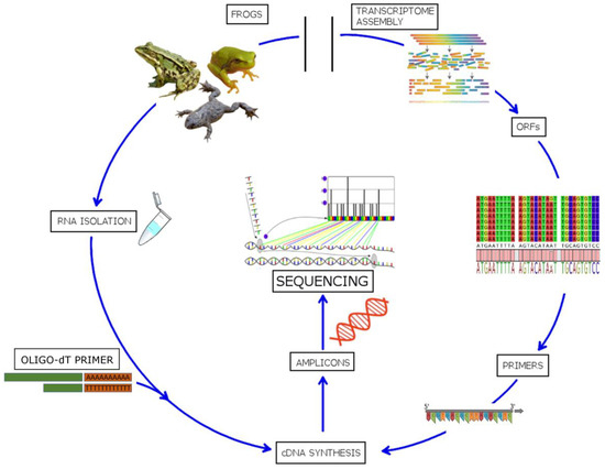 Improvement in NGS techniques and analysis pipelines, as well as the abundance of publicly available genomic and transcriptomic data, has led to the development of high-throughput techniques for simultaneous identification of potential AMPs. Kim et al. [191] reported a de novo transcriptome analysis of the American cockroach Periplaneta americana, which leads to the discovery of 86 putative antimicrobial peptides out of which 21 were experimentally verified for this activity. A similar approach was used for the identification of novel AMP sequences in the grasshopper Oxya chinensis sinuosa [192]. A novel method has recently been successfully developed for simultaneous identification of AMPs in different frog species [193]. By utilizing highly conserved signal regions of the peptide precursors (see Section 3) to design forward degenerate primers and correlating with transcriptomic and proteomic data available in public databases, ~130 different potential AMPs were identified, of which 29 were novel sequences (see Figure 7). The same procedure could, in principle, be applied to other organisms that have AMP gene families with comparable properties, i.e., a conserved signal peptide region associated with hypervariable mature peptide regions.