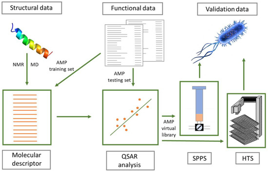 QSAR approaches may include virtual screening studies where the biophysical properties of known active peptides are used to construct molecular descriptors that are associated with different functional aspects. These descriptors are then used to link a novel sequence to its likely biological activity [203]. The main assumption is that a mathematical function can be developed that correctly links physico-chemical properties (e.g., net charge and amphipathicity) with an observable outcome [e.g., minimal inhibitory concentration (MIC) values]. Typically, a number of molecular descriptors are created by linking physico-chemical properties with the biological effect in a training set of peptides where the former are measurable and the latter are experimentally determined. This is followed by a statistical analysis to determine which descriptor (combination of parameters) provides a predicted functional value that correlates best with the experimentally-determined values. The QSAR model is then validated on an external (testing) set of peptides (see Figure 8) [204,205].