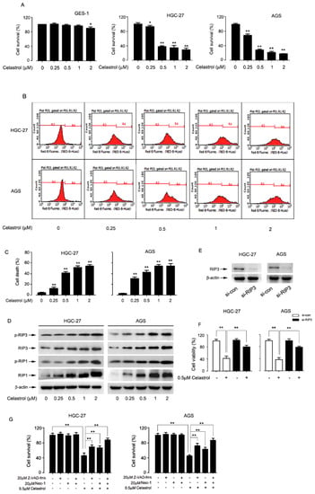 Recently, it was reported that natural compounds such as matrine [], tanshinone IIA [], shikonin [], induced cancer cell death by necroptosis. Celastrol inhibited the growth of gastric cancer cells [], however, whether necroptosis participated in the event of celastrol-induced cell death is unknown. To investigate whether celastrol induces necroptosis in gastric cancer cells, we first tested the cytotoxicity of celastrol in cell lines (HGC-27, AGS) and human normal gastric epithelial cell line GES-1 cells. Results from MTT assay showed that celastrol inhibited proliferation in a dose-dependent manner in two cells lines tested. However, celastrol (0–1 μM) had no effect on the survival of GES-1 cells. About 60.0% suppression rate of cell growth was produced after treatment with 0.5 μM celastrol for 24 h (Figure 1A). We further explored necroptosis by PI staining and Western blotting assay. Flow cytometry analysis indicated that celastrol induced cell death in a concentration-dependent manner (Figure 1B,C).