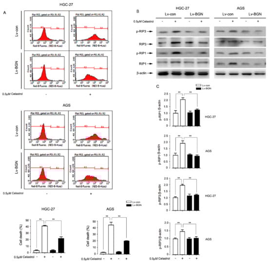 BGN down-regulated by celastrol is associated with necroptosis by regulating RIP1 and RIP3 in gastric cancer cells. BGN in HGC-27 and AGS cells was over-expressed with lentiviral vector, and then cells were treated with 0.5 μM celastrol for 24 h. The percentage of cell death was estimated by PI staining plus flow cytometry (A) and the expression of p-RIP1 and p-RIP3 was detected by Western blotting (B). The blots for p-RIP1 and p-RIP3 were semi-quantified using NIH image J (C). Results were presented as the mean ± S.D. of at least three independent experiments. Significant differences compared with controls were indicated as * P < 0.05 and ** P < 0.01. β-ac tin was used as an internal control.