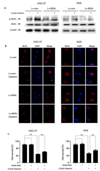 MLKL is the critical substrate of RIP3 in necroptosis signaling pathway. To confirm the finding that celastrol induced necroptosis, we tested whether MLKL participated in the event. As the results from Western blotting showed that celastrol induced the phosphorylation of MLKL, which was signficantly attenuated by BGN overexpression in HGC-27 and AGS cells (Figure 4A). Translocation of MLKL from cytoplasm to plasma membrane leading to fatal permeabilization of the plasma is required for necroptosis. The result from immunofluorescent staining showed that MLKL was originally located in the cytoplasm of control cells. However, most of MLKL moved to the plasma membrane after celastrol treatment, which was obviously prevented by over-expression of BGN (Figure 4B). Furthermore, the result showed that cell death caused by celastrol was significantly suppressed by MLKL-specific inhibitor necrosulphonamide (NSA) in HGC-27 and AGS cells (Figure 4C). These data together indicate that celastrol down-regulates the expression of BGN to activate RIP3/MLKL signaling, leading to necroptosis in HGC-27 and AGS cells.