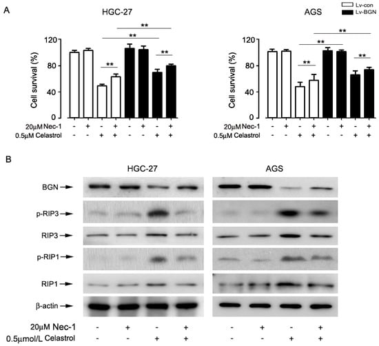 2.5. Inhibition of Necroptosis by Nec-1 Attenuated Celastrol-Induced Cell Death in Part by Up-Regulating the Expression of BGN in HGC-27 and AGS cells