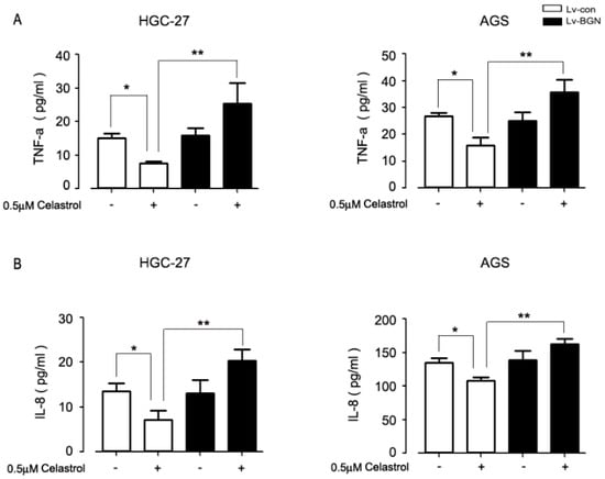 BGN up-regulated celastrol-attenuated inflammatory markers in HGC-27 and AGS cells. Cells expressing control (LV-con) or over-expressing BGN (LV-BGN) were treated with or without 0.5 μM celastrol for 24 h. After then, TNF-α (A) and IL-8 (B) secretion was determined using ELISA method. Data are the mean ± SD of three independent experiments. Significant differences compared with controls were indicated as * P < 0.05 and ** P < 0.01.