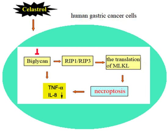 In the present study, we have found a novel role of celastrol as an anti-tumor medicine through reducing the expression of BGN to activate RIP1/RIP3/MLKL signaling pathway, leading to necroptosis and decreased secretion of pro-inflammatory cytokines in HGC-27 and AGS cells (Figure 7). Celastrol-induced necroptosis was confirmed by necrosis-related protein RIP1 and RIP3, and the rescue effects of necroptosis inhibitor Nec-1 and NSA. High expression of BGN was existed in gastric cancer cells, which was down-regulated by celastrol in a dose dependent manner. On the basis of the key role of RIP1/RIP3/MLKL signaling in necroposis [,], we proved that celastrol promoted the phosphorylation of RIP1 and RIP3 and plasma membrane translocation of MLKL in HGC-27 and AGS cells, which was prevented by BGN over-expression. Moreover, further results showed that necroptosis inhibitor Nec-1 attenuated the inhibition effect of celastrol on BGN. In addition, celastrol inhibited the production of pro-inflammatory cytokines in HGC-27 and AGS cells by blocking BGN. This study unveils the mechanism of celastrol-induced gastric cancer cell death and underscores the importance of BGN-mediated necroptosis and inflammation in celastrol-induced cell death.