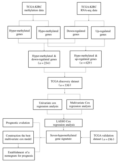 Gene expression data and DNA methylation data were employed to identify DEGs with an altered methylation status. Firstly, Student’s t-test and fold-change (FC) were used to determine DEGs in KIRC. Next, the DNA methylation status of genes was compared between KIRC samples and matched normal samples by using the Chip Analysis of Methylation Pipeline (ChAMP) [74,75] available in the R Bioconductor package. Then, both downregulated genes with a hypermethylated status and upregulated genes with a hypomethylated status were identified as candidate genes for prognosis.