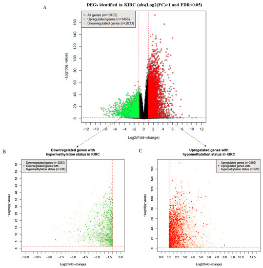 After performing Student’s t-test, a Benjamini–Hochberg correction was conducted to obtain the false discovery rate (FDR, i.e., the q-value) [23]. Then, with cut-off values of FDR < 0.05 and , 2033 downregulated and 3466 upregulated genes were identified as being differentially expressed genes (DEGs) (Figure 2A). Furthermore, by comparison with the DNA methylation status, 863 DEGs were detected as being MDEGs in KIRC, including 234 downregulated genes with a hypermethylated status (Figure 2B) and 629 upregulated genes with a hypomethylated status (Figure 2C).