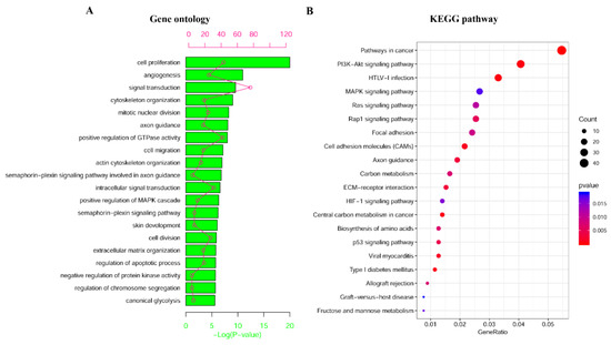 Moreover, a function enrichment analysis was done through the database for annotation, visualization, and integrated discovery (DAVID, https://david.ncifcrf.gov/) for the 863 MDEGs, which revealed that these MDEGs were significantly enriched in cell proliferation, angiogenesis, and signal transduction, among other things (Figure 3A). Enriched Kyoto Encyclopedia of Genes and Genomes (KEGG, https://www.genome.jp/kegg/) pathways were also detected for these MDEGs. The analysis showed that they were enriched in pathways in cancer, HTLV-I infection, and PI3K-Akt signaling, among others (Figure 3B). Therefore, MDEGs were found to be involved in many important biological processes and pathways in cancer.