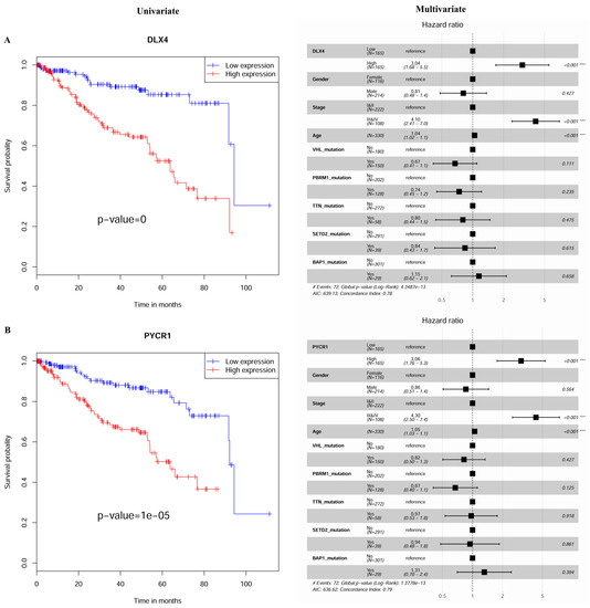 The expression signature that is associated with survival outcomes in KIRC. (A) Kaplan–Meier curves show the overall survival of KIRC patients with a high and a low expression level of DLX4. Patients with a high expression level of DLX4 exhibited a significantly worse outcome compared with those with a low expression level of DLX4. A multivariable Cox regression analysis showed that DLX4 was an independent prognostic factor as compared with other confounding factors. (B) PYCR1 was found to be an independent prognostic marker for KIRC. A high expression level of this factor was associated with a worse outcome.