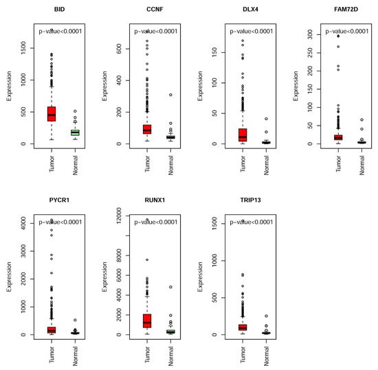 The expression level of seven hypomethylated genes (BID, CCNF, DLX4, FAM72D, PYCR1, RUNX1, and TRIP13) in KIRC and normal samples.