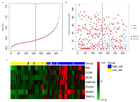 By performing both a univariate and a multivariate Cox regression analysis for the 863 MDEGs, we identified 189 MDEGs as potential prognosis-related genes (p-value < 0.05). Then, we performed LASSO Cox regression on the 189 MDEGs to select the most informative gene set for prognosis (Figure S1). Eventually, seven MDEGs (BID, CCNF, DLX4, FAM72D, PYCR1, RUNX1, and TRIP13) that were highly associated with prognosis were selected as features for a risk score model (Table 2). Finally, we constructed a formula to calculate the risk score for predicting prognosis based on the expression levels of the seven genes in KIRC patients.