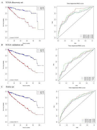 The Kaplan–Meier plot (low-risk vs. high-risk group) for KIRC patients (left panel); Receiver operating characteristic (ROC) analysis of the sensitivity and specificity of the survival time by a risk score based on the seven-MDEG signature of KIRC (right panel) in (A) the TCGA discovery dataset, (B) the TCGA validation set, and (C) the entire set.