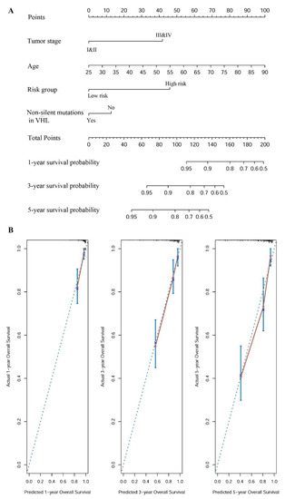 A nomogram for overall survival (OS) prediction in KIRC. (A) A nomogram for predicting OS in KIRC. This nomogram has four components: tumor stage, age, risk group, and non-silent mutation status of VHL. Each component corresponds to points according to the first axis “Points”. The total number of points of the four components of one patient lie on “Total Points” axis, which corresponds to the 1-, 3-, and 5-year survival probability that is plotted on the last three axes. (B) Calibration plots of the nomogram for predicting the OS rate at 1-, 3-, and 5-year survival, respectively.
