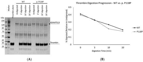 We performed enzymatic digestion and circular dichroism (CD) analysis of the purified protein to assess conformational differences between WT and p.P118P variants. Subtle differences in protein conformation can be inferred from differential access of a digestive enzyme to cleavage sites within a substrate protein. We have employed thrombin, an enzyme with known proteolytic activity against ADAMTS13 [], for this analysis. In this assay, digestion of purified WT and p.P118P variants with thrombin for 3, 10, or 20 min, revealed no significant differences (Figure 2). Similarly, CD analysis also revealed largely similar spectral profiles revealing no significant differences (Figure S4).