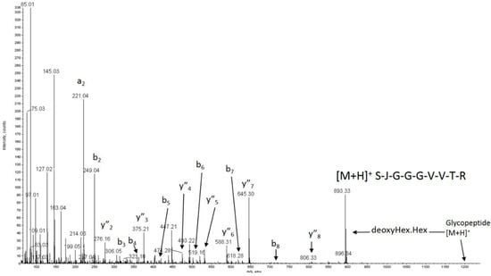 Using mass spectrometry, we also assessed post-translational modifications, which are well recognized to impact protein secretion and protein folding []. The data collected were interpreted according to the standard principles of protein and glycoprotein mass spectrometric fragmentation pathways [,,]. The mass spectrometry data for WT ADAMTS13 demonstrated the presence of seven Thrombospondin Repeats (TSRs; 1, 2, 3, 5, 6, 7, and 8) possessing the consensus sequences for possible O-fucosylation of S/T [,], all seven of which were found to be modified with deoxyhexose-hexose in the present study (Table 3). Interestingly, the data showed clear evidence for the presence of the previously unreported O-glycosylation of TSR-1 at S399 (Figure 3).