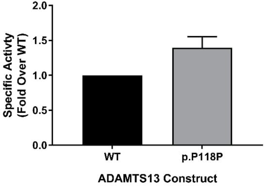 Using FRETS-VWF73 assay [], we measured the activity of purified WT and p.P118P variants to assess the potential impact of altered translation on specific activity. We have measured activity in purified protein samples from two independent preparations that were ensured to have equal concentrations by densitometry analysis of western blots (silver staining and antibody probing). In this analysis, rather unexpectedly, p.P118P variant showed higher specific activity over WT (1.4 ± 0.16-fold, p = 0.0349) (Figure 4). This observed difference was in spite of lack of discernible changes in conformation or post-translational modifications.