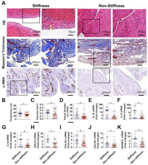 Subacromial bursa in the stiffness group showed synovial membrane hypertrophy as evident from hematoxylin and eosin staining. Fibrotic tissue exhibited blue and non-fibrotic tissue displayed red in Masson’s trichrome-stained specimens. Specimens in the stiffness group showed spacious fibrotic tissue formation as compared to the non-stiffness group. Vessel overdevelopment also occurred in the stiffness group as evident from strong α-smooth muscle actin (α-SMA) immunostaining (Figure 1A). Consistently, synovial membrane thickness (Figure 1B), fibrotic tissue area (Figure 1C), and vessel number (Figure 1D) were significantly increased in the stiffness group. In addition, inflammatory cytokines, like interleukin (IL)-1β (Figure 1E), IL-6 (Figure 1F), and IL-8 (Figure 1G) expression along with fibrotic matrices collagen (COL)1A1 (Figure 1H), COL3A1 (Figure 1I), COL4A1 (Figure 1J), and ADAM12 (Figure 1K) expression were significantly increased in the stiffness group.